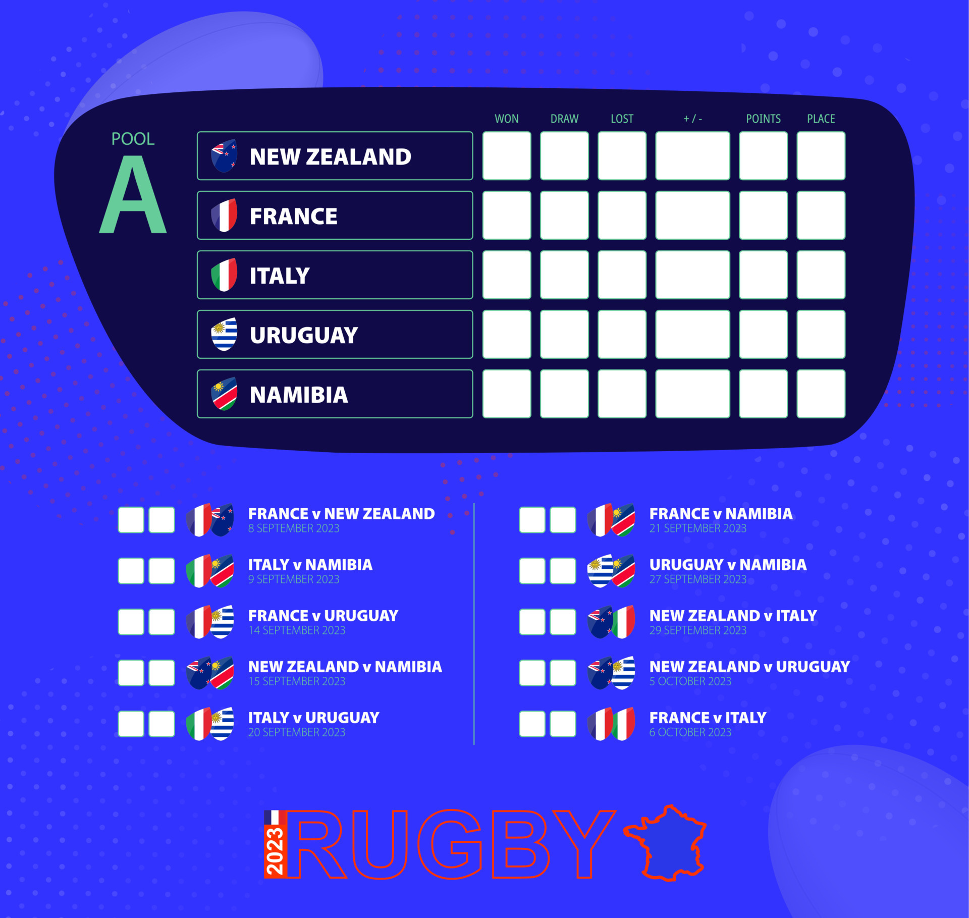Source : umbrellacompanies.org.ukRugby cup 2023, Pool A match schedule. Flags of New Zealand